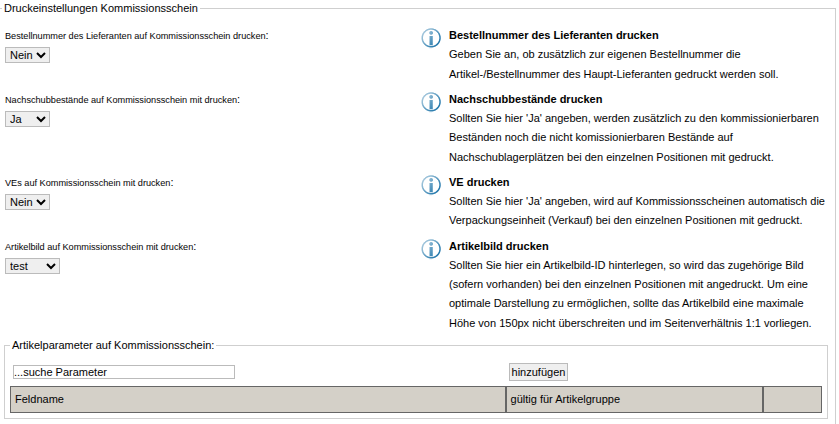 Desweiteren können die Druckeinstellungen für Kommissionsscheine hinterlegt werden: