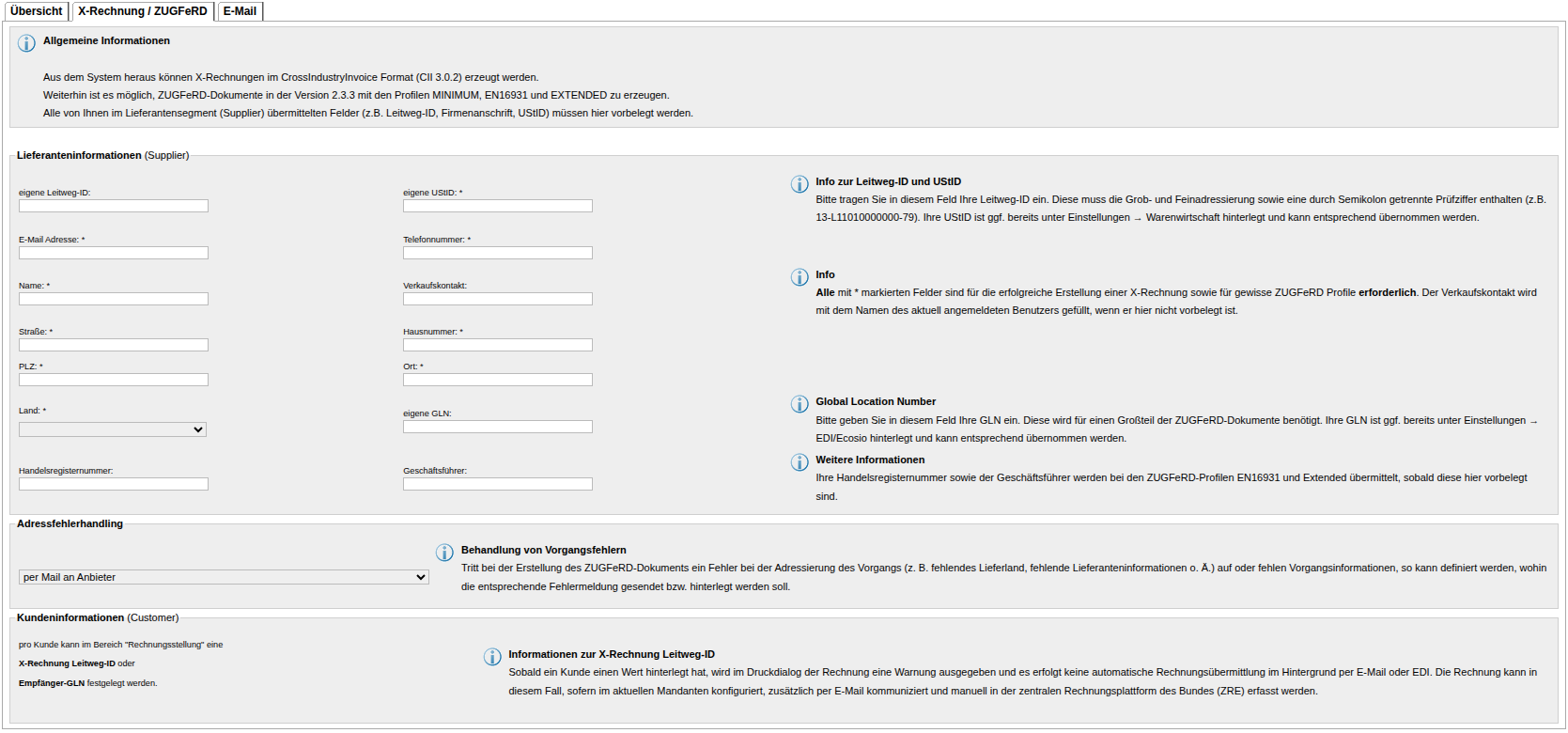 Alle von Ihnen im Lieferantensegment (Supplier) übermittelten Felder (z.B. Leitweg-ID, Firmenanschrift, UStID) müssen hier vorbelegt werden.