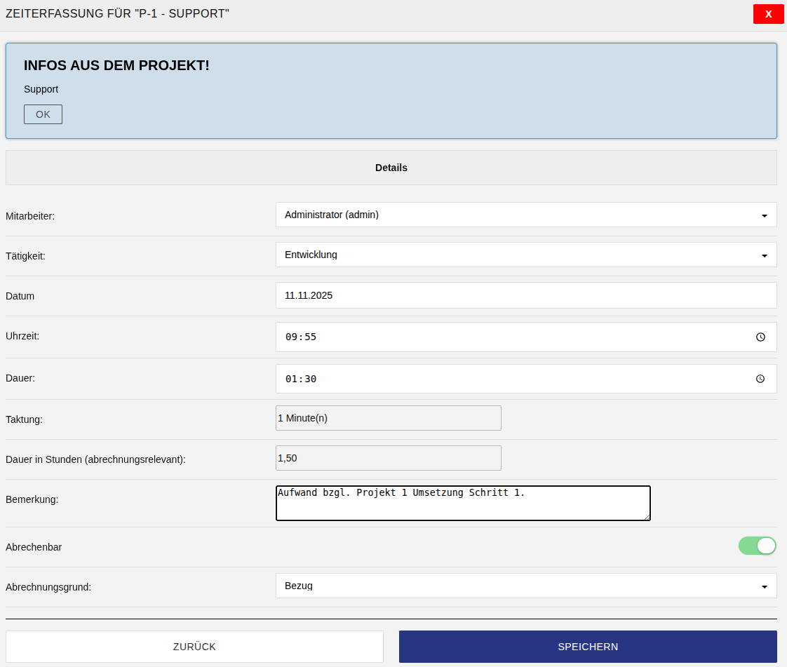 Sind alle Daten korrekt erfasst und ein Zeitaufwand größer Null angegeben, kann die entsprechende Erfassung über die Schaltfläche Speichern abgeschlossen werden.