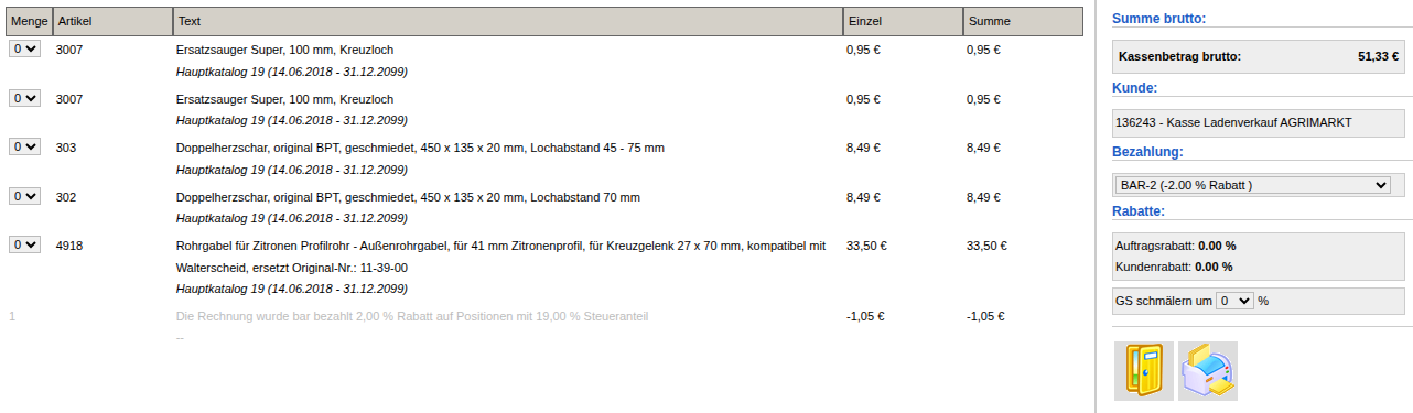 Der Kassenmodus ermöglicht es, Barzahlungen von Kunden ohne Kommissionierung abzuwickeln. Bei der Rechnungsstellung wird trotzdem auf den erfassten Warenbestand zugegriffen. Die Barzahlung (und der Umsatz) werden nach der Rechnungsstellung direkt im System verbucht.