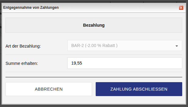 Durch Betätigen der Schaltfläche "Abbrechen" können Sie zum Vorgang zurückkehren und letzte Änderungen an der Zahlart vornehmen. Nach Abschluss des Kassiervorgangs wird die Zahlart fest hinterlegt.