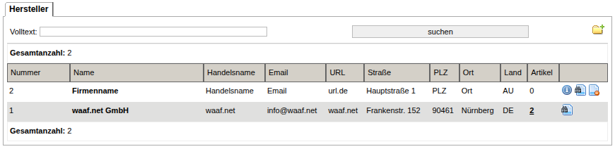 Mit der entsprechenden Berechtigung können Hersteller (und ggf. notwendige Importeure) im Bereich „Hersteller” (Ordner mit Plus-Symbol) angegeben, aktualisiert (Blatt mit Fernglas) oder gelöscht (Blatt mit rotem Kreis) werden. Bitte beachten Sie, dass Hersteller nur gelöscht werden können, wenn ihnen keine Artikel zugewiesen sind.