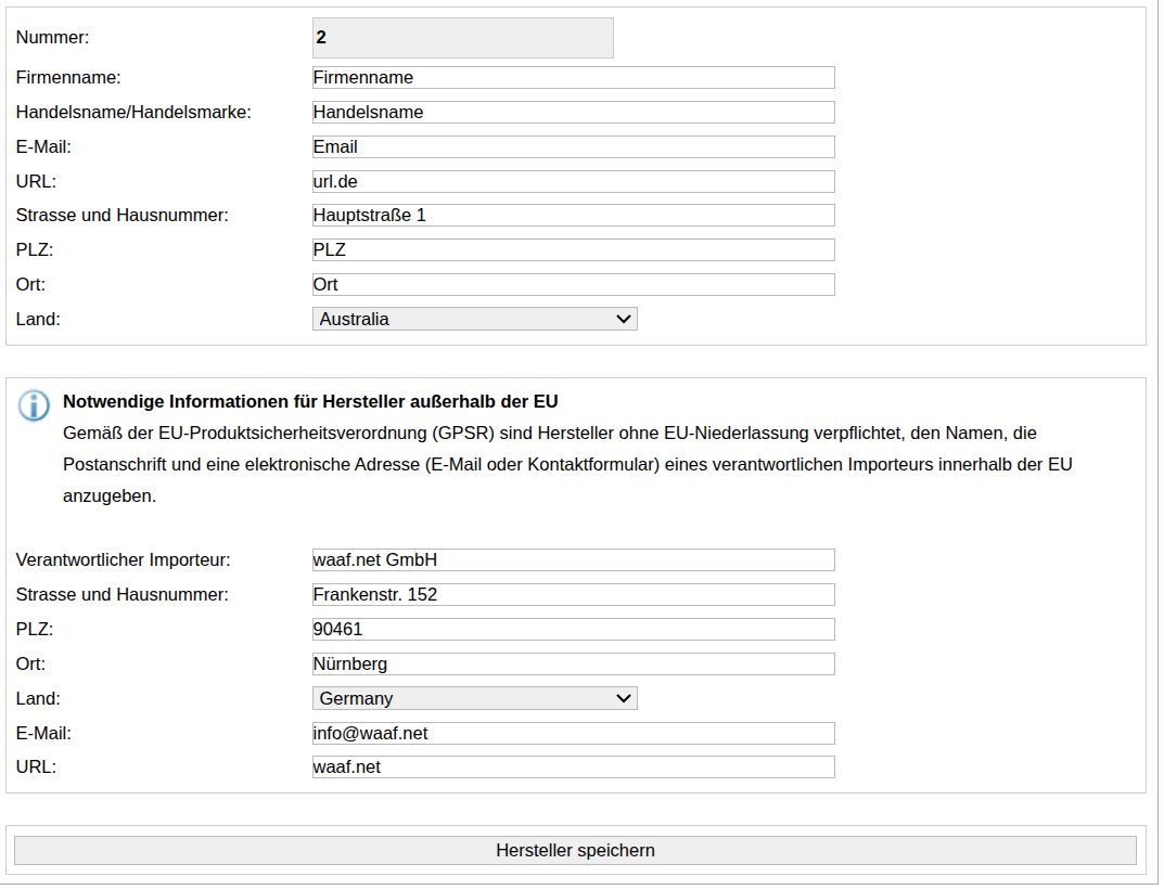 Wird beim Anlegen oder Editieren eines Herstellers ein Land außerhalb der EU ausgewählt, erscheint der Bereich „Notwendige Informationen für Hersteller außerhalb der EU”. Hier kann der entsprechende Importeur angegeben werden.